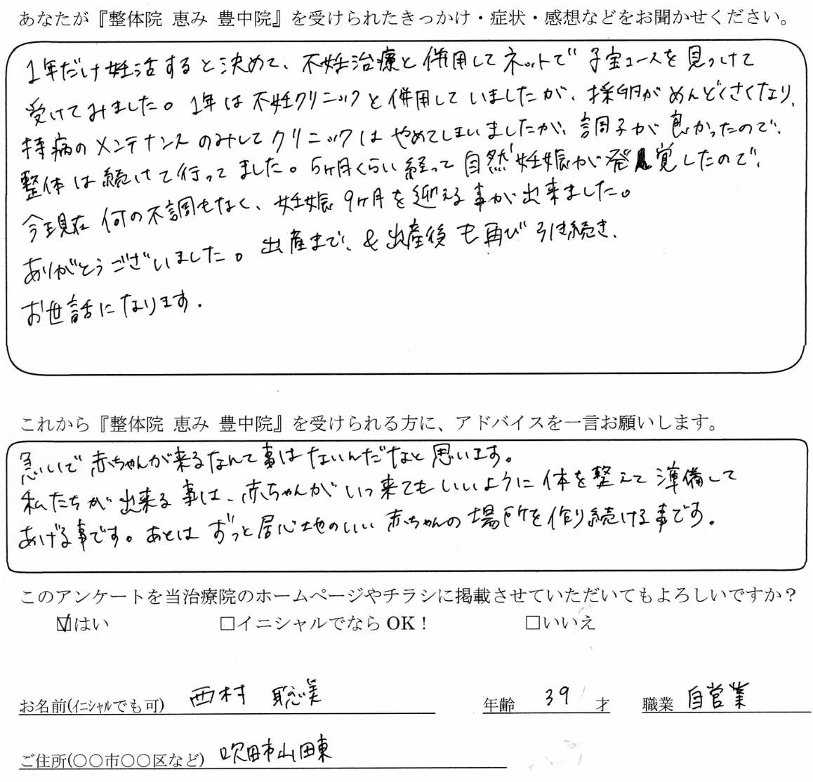 整体院恵み豊中院の子宝コースに通われ、約6ヶ月後に顕微授精でご懐妊、その後順調に出産されました。